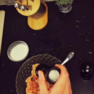 Pregătim un bol în care adăugăm sosul de chili,oțetul balsamic,sosul de soia,mierea,lingura de amidon,ghimbirul,50 ml apa și amestecăm. Peste sosul obținut punem puiul,îl amestecăm și pe el,apoi dăm bolul deoparte.